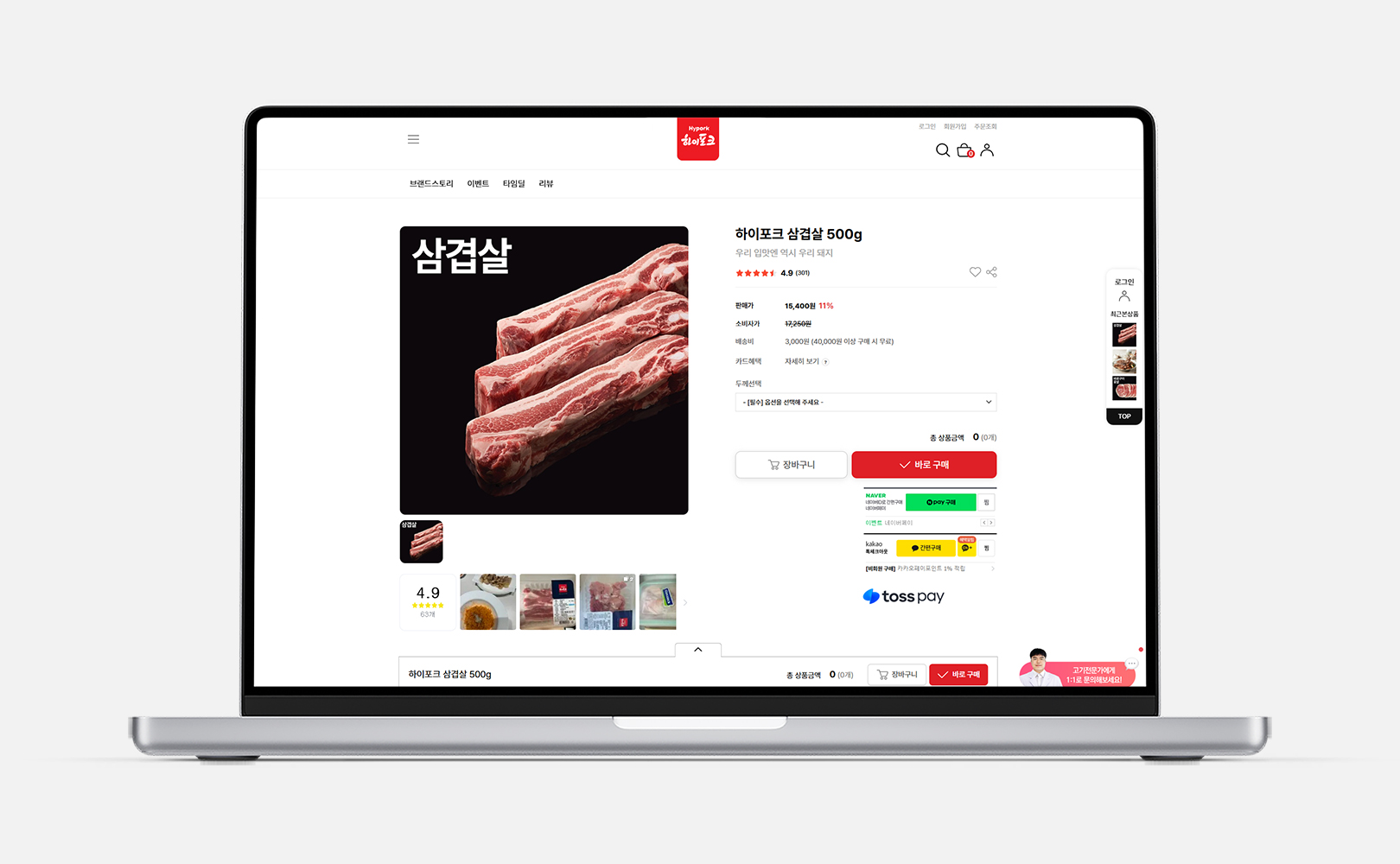 국내 최초의 냉장 돈육 브랜드 하이포크의 온라인 쇼핑몰을 리뉴얼 했습니다. 사용자 중심의 설계로 편리한 탐색과 직관적인 인터페이스를 구현했으며, 세련된 디자인과 조화로운 구성으로 브랜드의 가치를 효과적으로 전달합니다. 제품 정보와 시각적 요소가 유기적으로 배치되어 고객이 원하는 정보를 쉽고 빠르게 확인할 수 있습니다. 브랜드의 아이덴티티를 담은 이미지와 영상은 제품의 품질과 신뢰감을 높이며, 하이포크만의 차별화된 매력을 돋보이게 합니다.